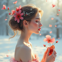 pink flowers that seem to be floating effortlessly towards her like tiny snowflakes. The background of the image is softly blurred, but it appears to be a snow-