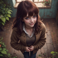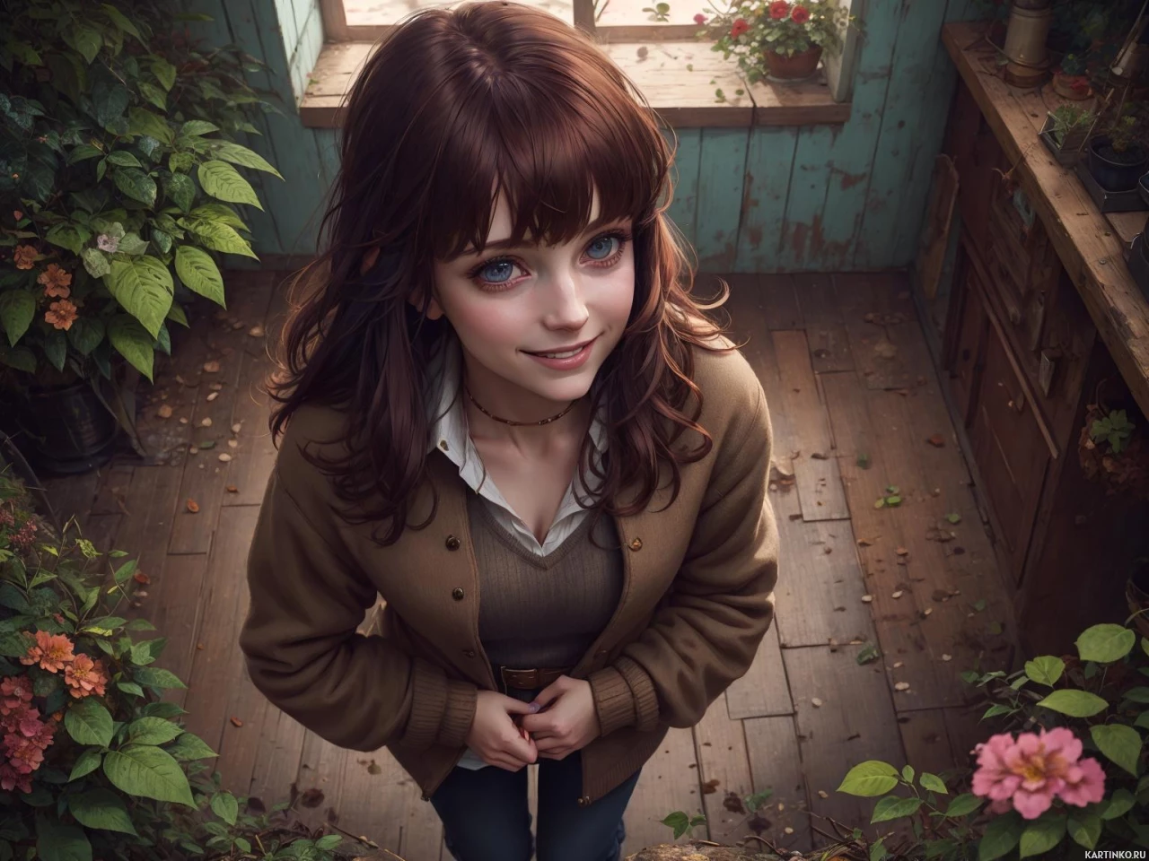 brown hair and is wearing a beige jacket over a light brown top. Her expression suggests she might be sad or lost in thought, as she's looking down with her hands clasped together. There are flowers at the base of the image on the left side, which include pink and yellow blossoms. The background consists of a rustic wall paneling that is blue-grayish, with what appears to be an old wooden cabinet or shelf to the right, indicating a vintage