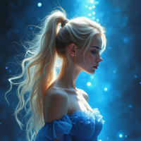 blonde hair, styled in a ponytail that flows down her back. Her fair skin and bright