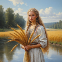 a young woman with long blonde hair, wearing a white dress with orange and blue accents, standing in front of a serene landscape. In the foreground, the woman holds a bouquet of wheat stalks in her hands, which are adorned with
