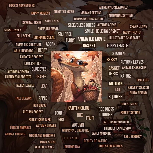 an autumnal setting, holding a basket of berries. * The squirrel is wearing