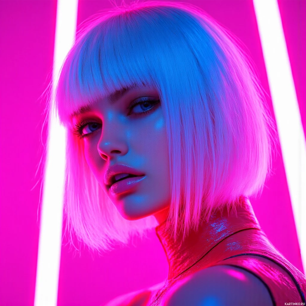 an otherworldly glow surrounding her face and hair, giving the impression of a futuristic or sci-fi setting. The overall mood of the image is one of mystery and intrigue, as if the woman is hiding secrets or waiting for something to happen. The use of neon lighting adds