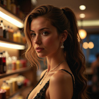 delicate necklace adorns her neck, complemented by dangling earrings that add a touch of sophistication to her overall look. In the background, shelves stocked with