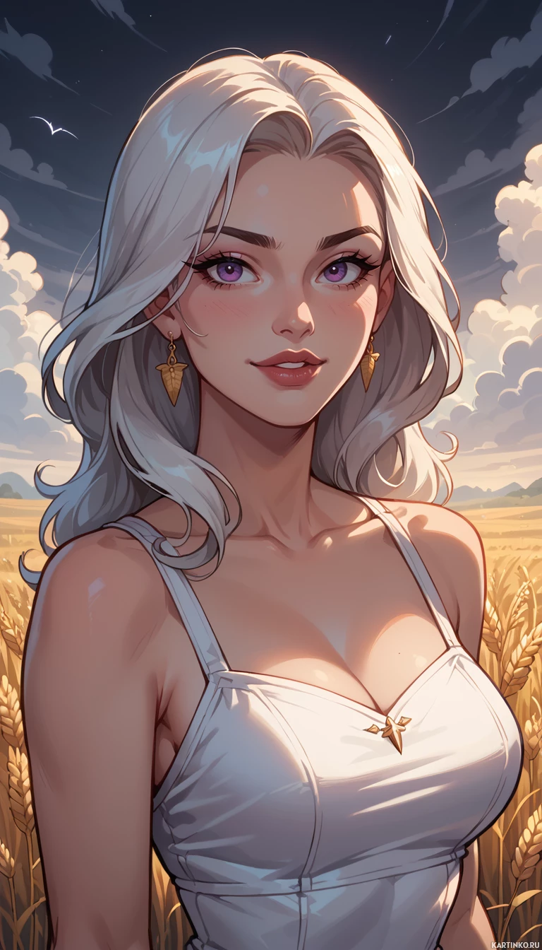 a young woman with long, wavy white hair and purple eyes, wearing a white tank top adorned with a gold star brooch. She sports dangling earrings featuring gold arrowheads suspended from her ears. Her skin tone is fair, and she has
