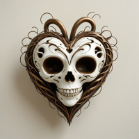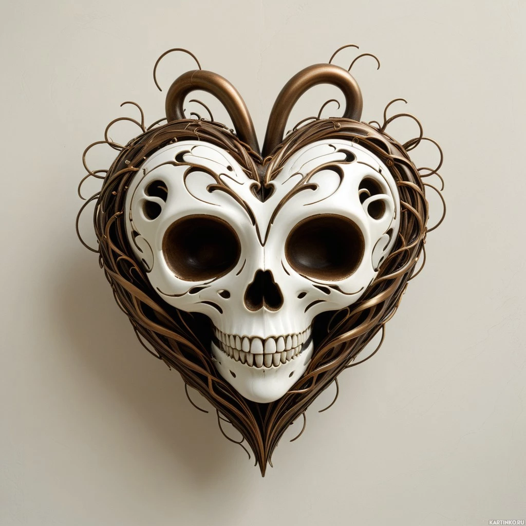 the heart shape to create a sense of organic growth and interconnectedness. The combination of these elements results in a visually captivating piece that evokes themes of mortality, transformation, and the cyclical