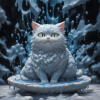 a white cat sitting on an icy surface, surrounded by melting ice and snow. The cat's fur is covered in frost, giving it a chilly appearance. **Cat Description** * **Color**: White * **Eyes**: Greenish-yellow * **Nose**: Pink * **Ears**: Pointed and pink The background of the image shows