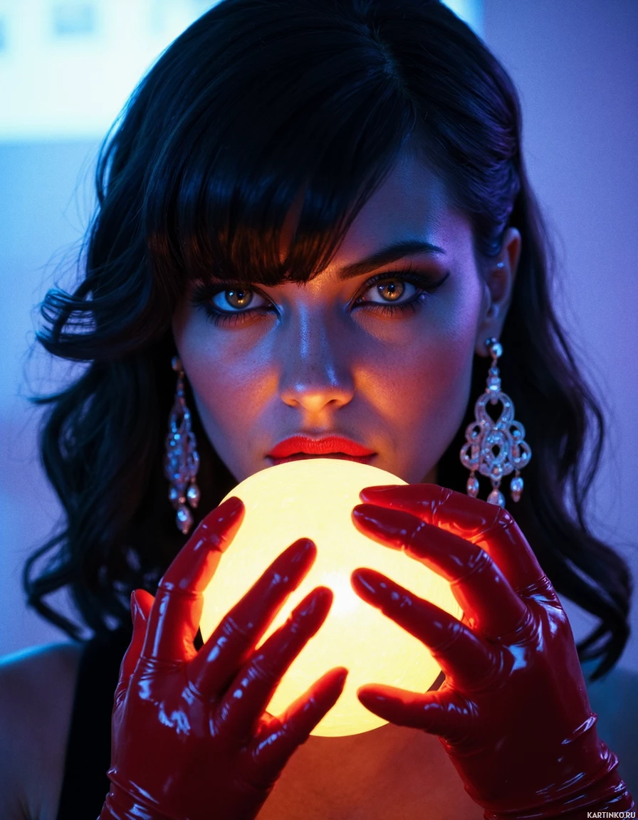 yellow light and appears to be made of a translucent material, possibly glass or crystal. Her fingers are wrapped around the orb, with her thumbs on either side, and her palms facing outward. The background of the image is blurred, but it appears to be a room with