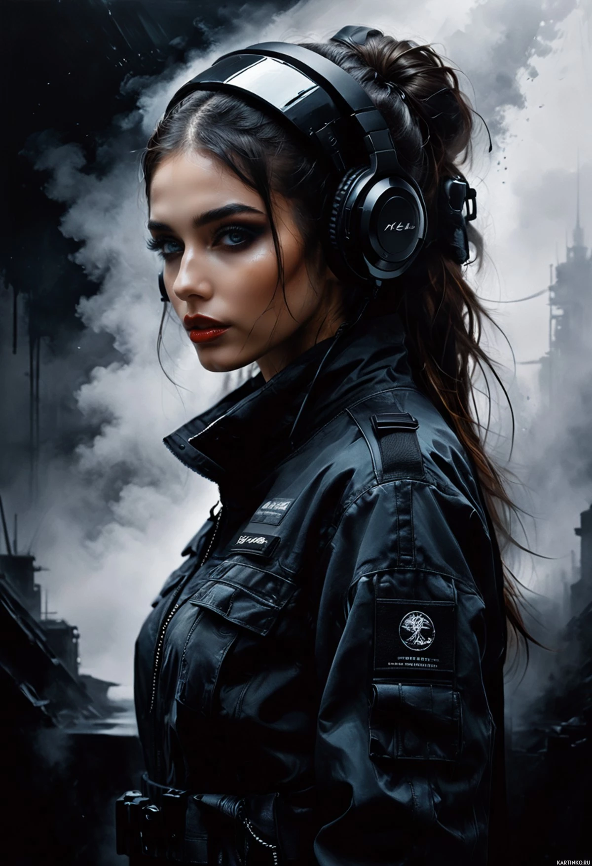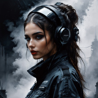 a female character with dark hair styled into a bun. She is wearing headphones over her ears and has