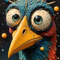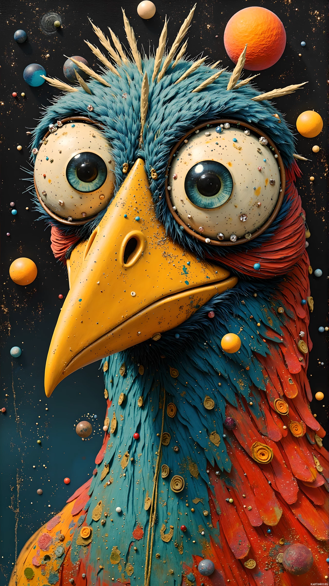 a large head, long beak, and striking blue-green feathers. The bird's eyes are wide open and appear to be looking straight at the viewer, giving it an almost human-like expression. Its body is covered in small, colorful balls that resemble either eggs or planets, adding to