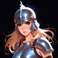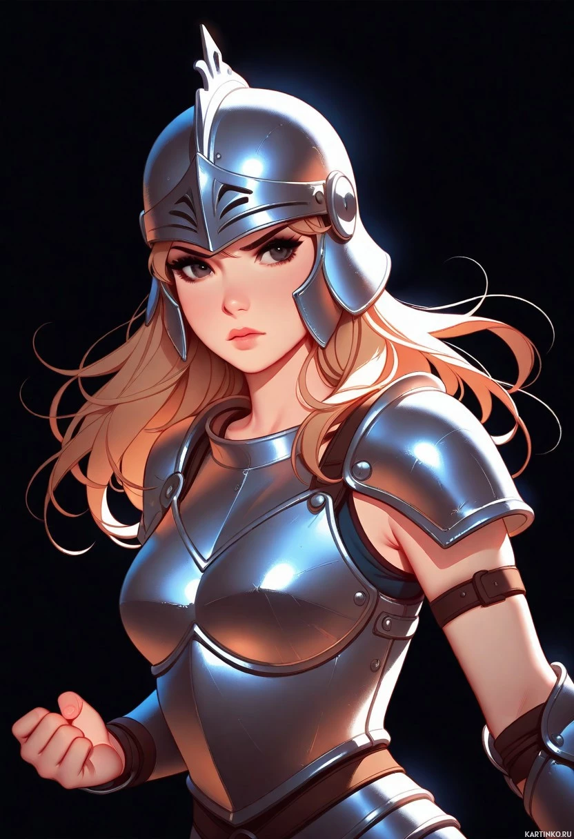 arm guards, and greaves, all crafted from the same shiny metal as the helmet. The background of the image is black, which helps to accentuate the details of the woman's armor and facial features. Overall, the illustration presents a striking and dynamic portrayal of