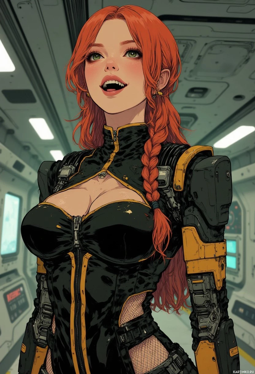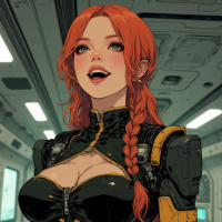 red color, matching the color of her hair. In the background, there appears to be some kind of control panel or dashboard, although it is not clear what specific features it contains. The overall atmosphere of the image suggests that the woman is in some kind of sci-fi or futuristic setting, possibly as part of a team or crew.