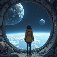 circular window dominates the foreground, providing an unobstructed view of the cosmos beyond. Through the window, one can see two planets in the distance, their surfaces partially obscured by clouds or haze. The sky above is