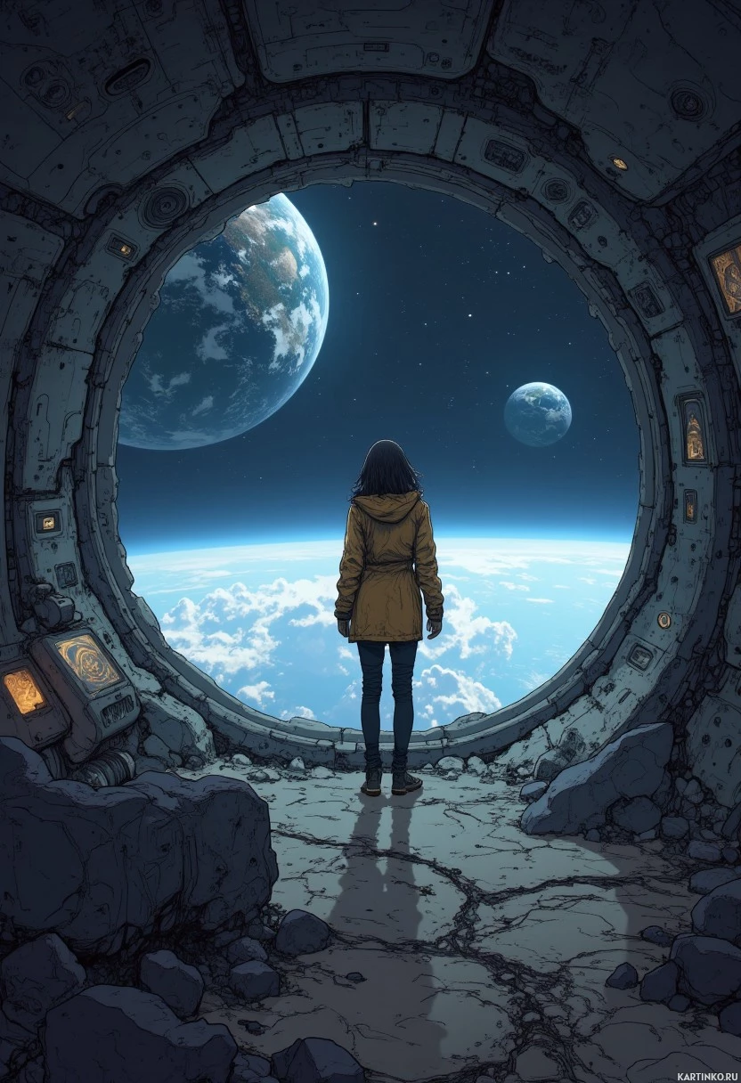 The image depicts a woman standing in front of a large circular window, gazing out at
