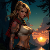 a red scarf around her neck, complemented by a brown belt with a silver buckle. The scene is set against the backdrop of a serene