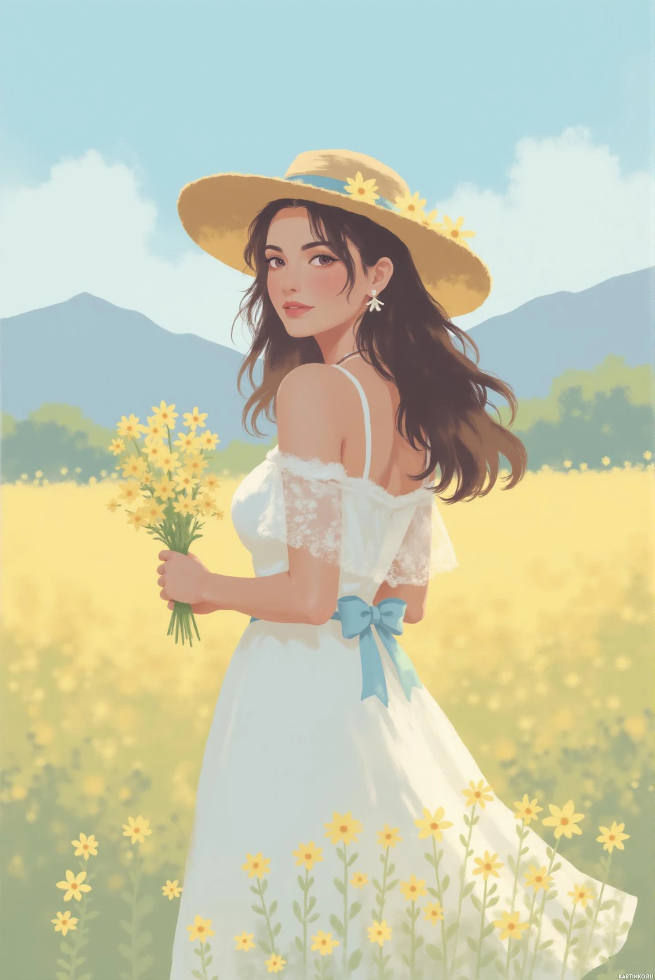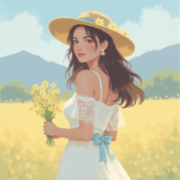 white dress that flows elegantly around her ankles, complemented by a stylish wide-brimmed hat adorned with daisies on the band. As she turns to face the viewer from behind, her long