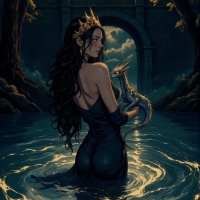 a fantasy scene featuring a brunette girl in a black dress. She is seated on a stone bridge that spans over what appears to be a calm