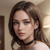 pale complexion and large, expressive eyes. Her lips are full and glossy, adding to her