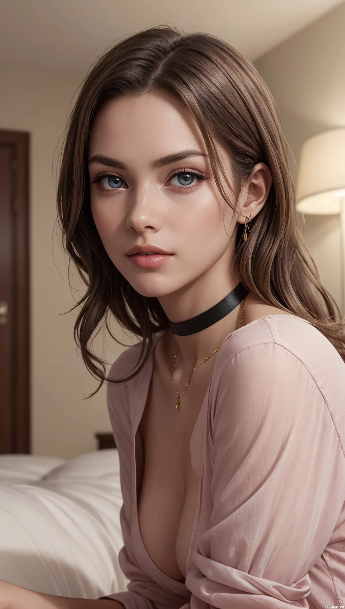 serene expression. She is wearing a light pink top that seems to be a blouse or shirt, paired with what looks like