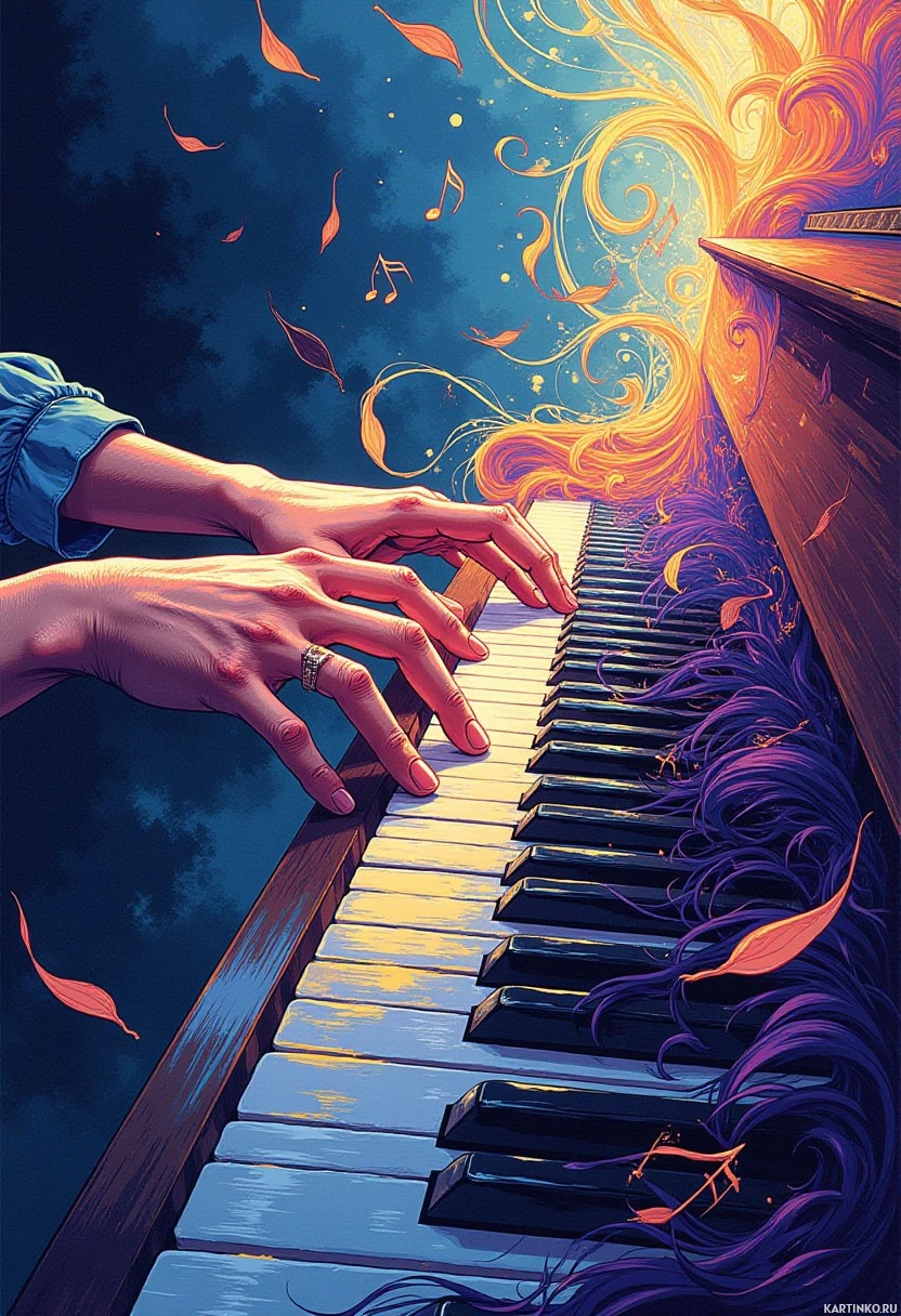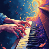 piano keyboard. Surrounding the person's hands are swirling patterns of yellow and orange, which appear to be stylized musical notes or other decorative elements. These patterns add a touch of elegance and sophistication to the overall scene, suggesting that the person is playing a classical piece of music or something equally refined. Overall, the image conveys a sense of creativity, skill, and passion for music. It highlights the importance of practice and dedication in mastering an instrument like the piano, as well as the joy and satisfaction that comes from expressing oneself through music.