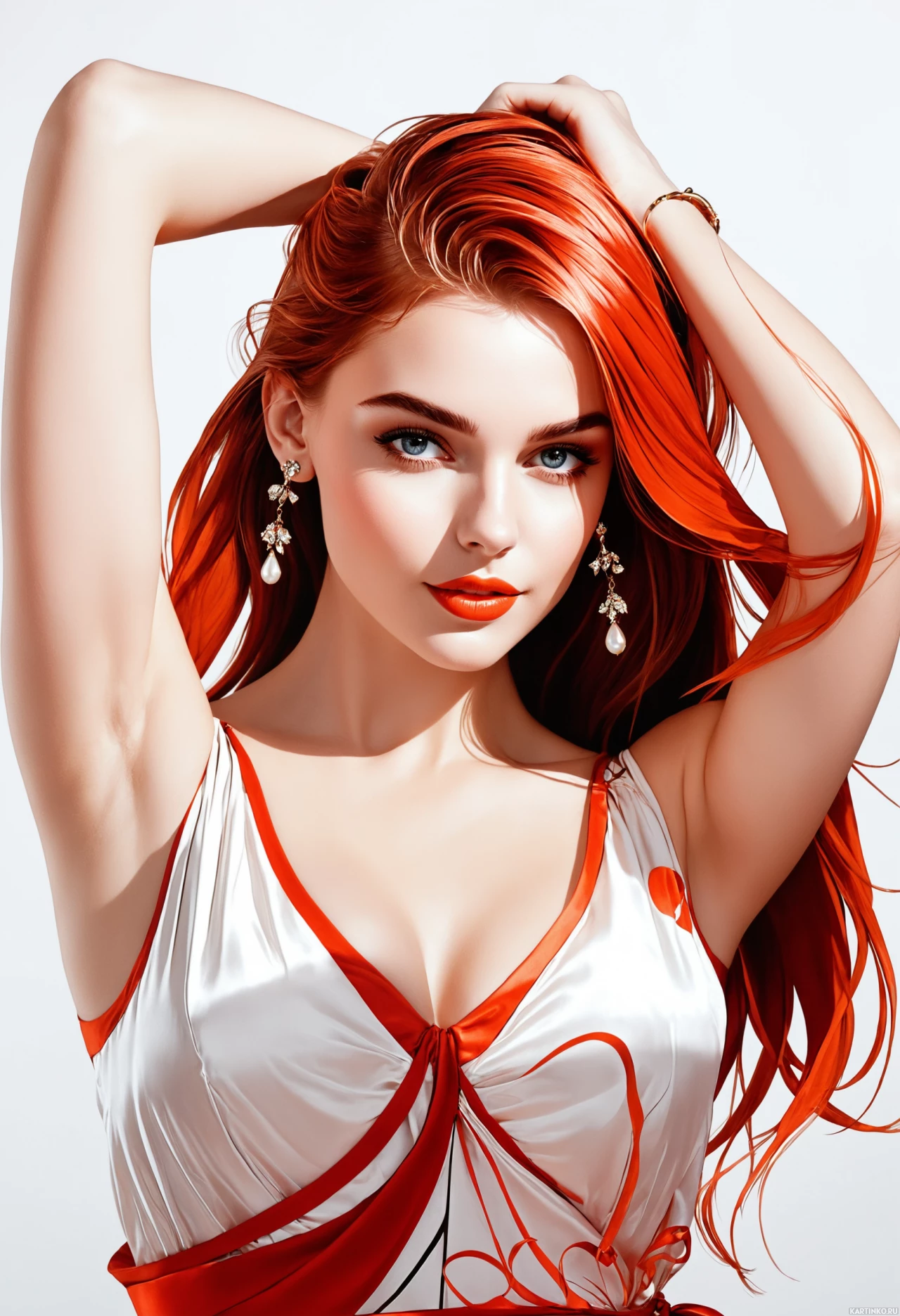 a touch of sophistication to her overall look. The woman's pose exudes confidence and poise as she leans forward slightly, with one hand raised behind her head in a relaxed manner. Her gaze is directed straight ahead, conveying a sense of determination and focus. The solid white background serves to further emphasize the subject's striking features and attire, creating a visually appealing and captivating image. In summary, the image presents a young woman with red hair, fair skin, and bright blue eyes, wearing an elegant white dress with intricate red designs and accessorized with a gold bracelet. Her confident pose and direct gaze create a strong visual impact, while the solid white background accentuates her features and attire.