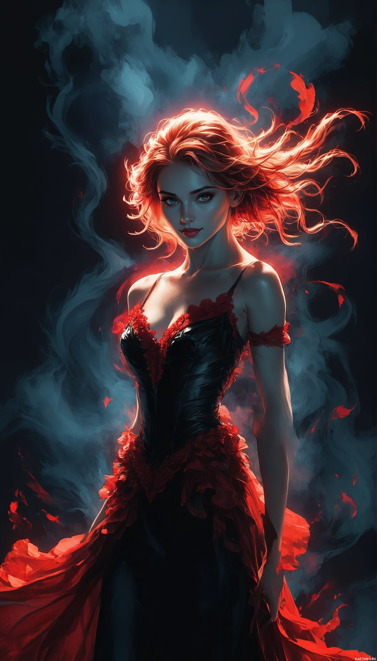 red hair, wearing a black and red dress that accentuates her slender figure. Her