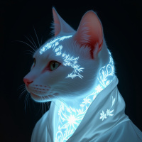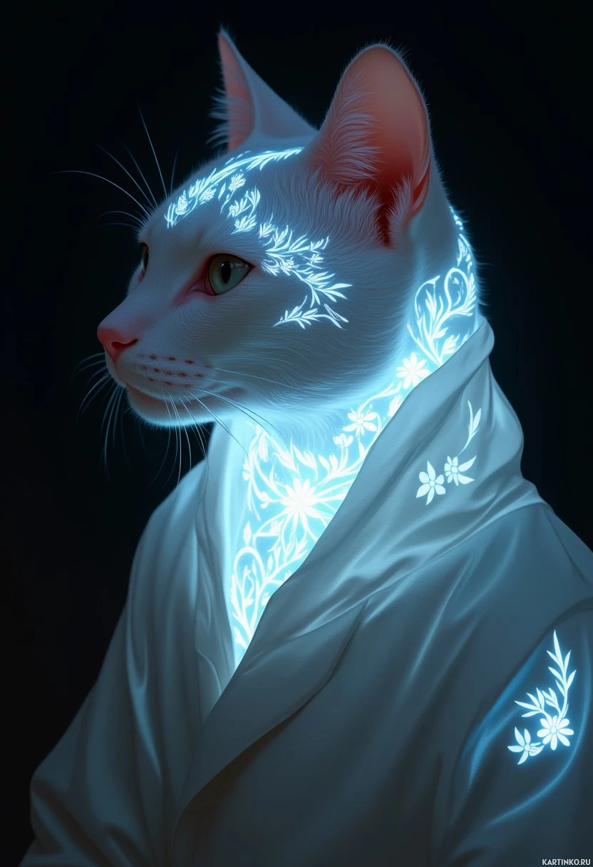 white robe that drapes elegantly over its body. The robe features delicate floral patterns embroidered along the edges, matching the glowing designs on the cat's face and neck. The overall effect is one of