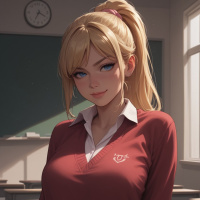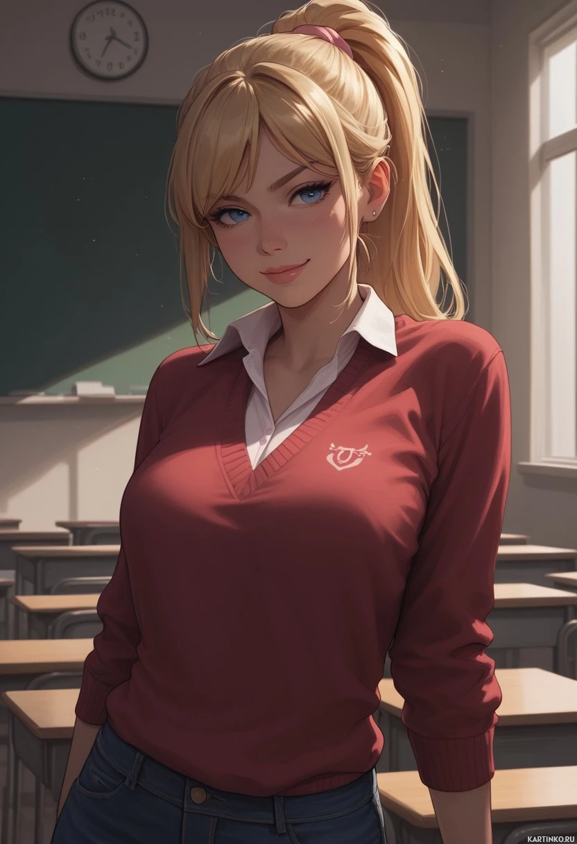 a young woman with blonde hair, dressed in a red sweater over a white collared shirt and blue jeans. She is standing in an empty classroom, surrounded by rows of desks and chairs. * The woman's attire suggests that she may be a teacher or student. * Her expression is neutral, but her posture conveys confidence and poise. * The background of the image features a blank blackboard with a few scattered chalk marks, indicating that the classroom has not been used recently. Overall, the image presents a serene and peaceful atmosphere, evoking