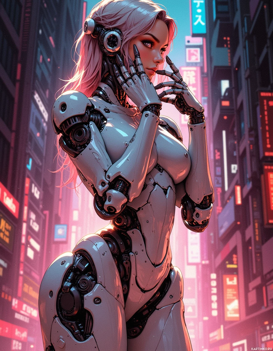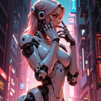 white hair flows behind her, adding to the overall sense of futurism. In the background, a cityscape stretches out, complete with towering skyscrapers and neon lights illuminating