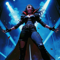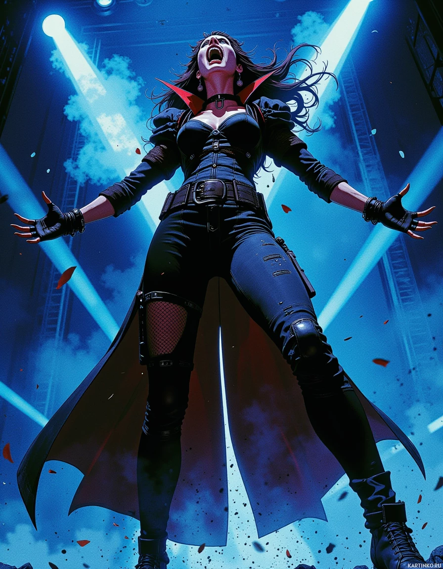 black pants, and black boots, and has a red collar around her neck. Her hands are outstretched to the sides, and she appears to be screaming or singing. The background of the image is a blue-