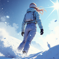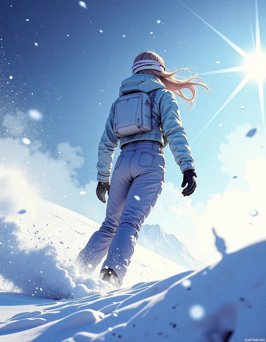 blue sky with white clouds. In this image, the woman is shown from behind, with her long blonde hair flowing in the wind as she snowboards down the slope. Her light blue jacket and pants provide