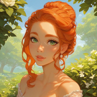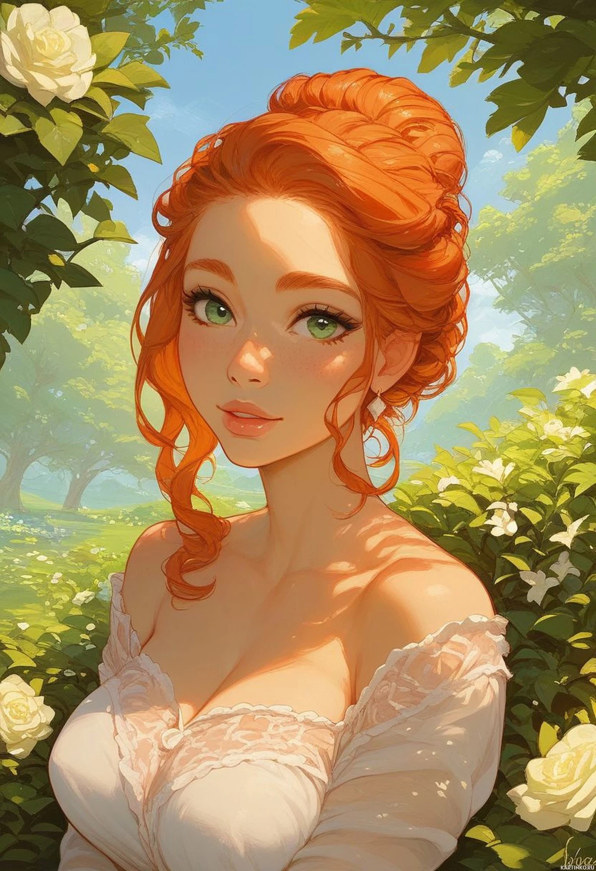 an elegant dress or top with lace details. Around her neck, there's a delicate collar with a ribbon-like design. The setting of the illustration is outdoors with
