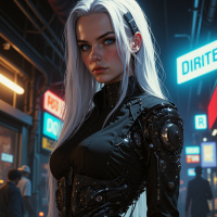 neon lights and bustling activity. The overall atmosphere is one of edgy coolness, suggesting that this is a character from
