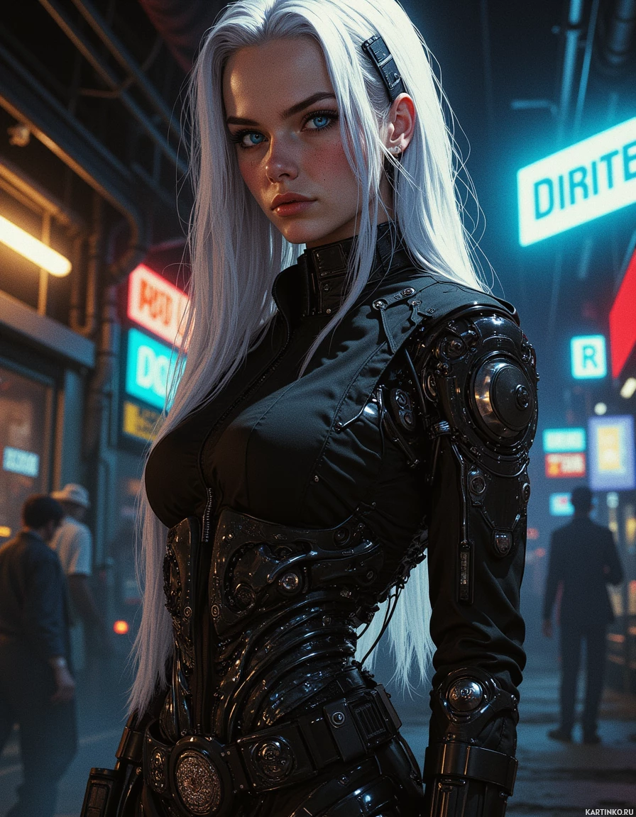 leather jacket adorned with metallic accents, evoking a sense of high-tech sophistication. The background of the image is blurred, but it appears to be a dimly lit cityscape at night, complete with
