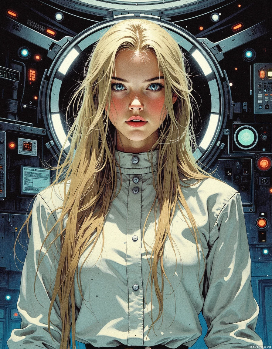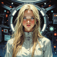 control panels, screens, and other technological devices, giving it an otherworldly appearance. The overall atmosphere of the image suggests that the woman has just entered this futuristic world or environment from another time period, and is struggling to adjust to its unfamiliar surroundings. The use of science fiction elements in the background, such as the portal and control panels, creates a sense of mystery and intrigue. It implies that the woman may have traveled through space and time to reach this location, and that she is now facing challenges and obstacles that are beyond her understanding. The image invites the viewer to ponder the possibilities and implications of this scenario, and to consider the themes of exploration, discovery, and transformation that it evokes.