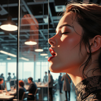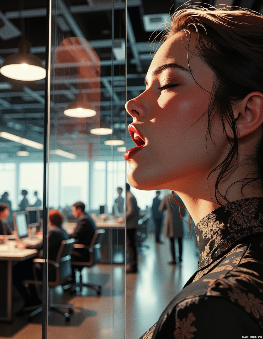 an office setting. The woman is positioned on the right side of the image, facing left. She has dark