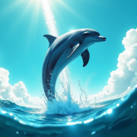 The image depicts a dolphin leaping out of the water, set against