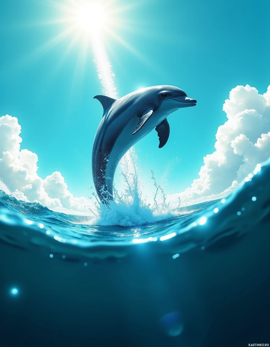 a backdrop of clouds and sun. The dolphin is positioned in the center of the image, with its body arched and tail raised as it breaks through