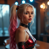 a young woman with blonde hair styled in a ponytail, adorned with pink highlights that extend down to her shoulders. Her attire consists of a red metallic bra top paired with black gloves and a matching