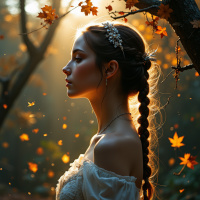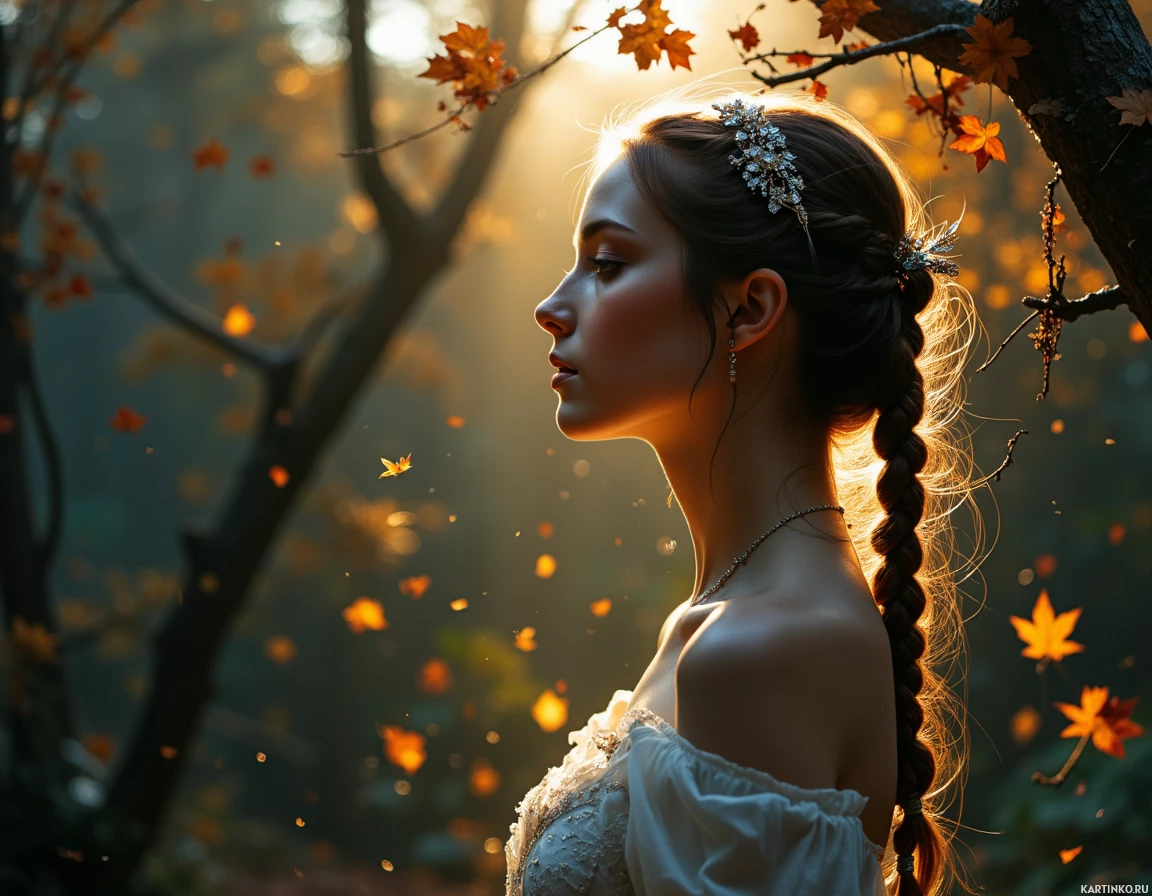 orange leaves scattered throughout the scene, suggesting that the image was taken during autumn or fall. The overall atmosphere of the image is serene and peaceful, with the young woman appearing relaxed and at ease in her surroundings.