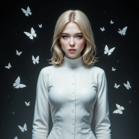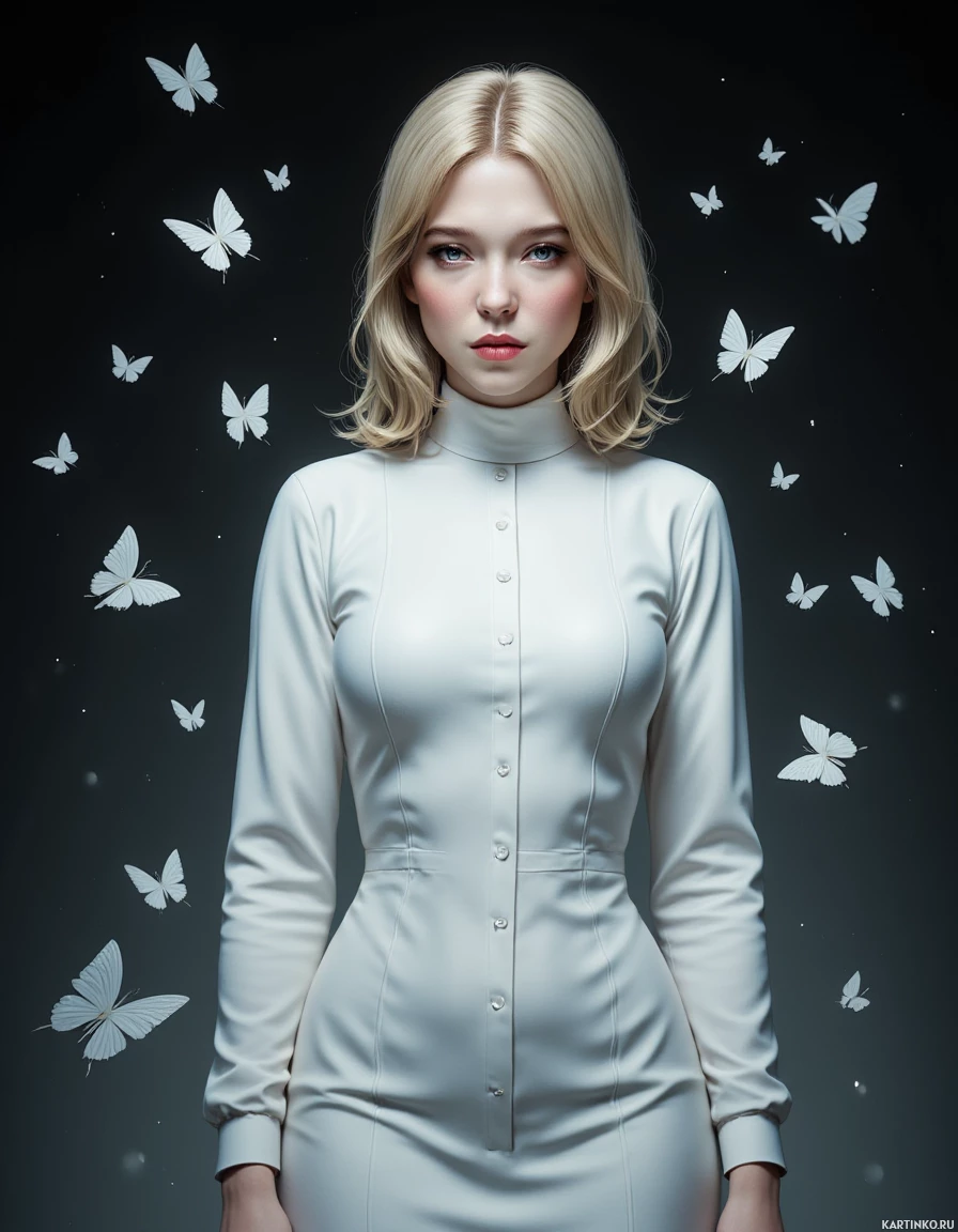 necked dress that reaches down to her ankles. The dress is made of a smooth, shiny material and has a fitted waistline. The background of the image is dark, with a subtle gradient effect that gives it a sense of depth. The butterflies are scattered throughout the background, adding a touch of whimsy and wonder to the overall scene. Some of the butterflies are in flight, while others appear to be perched on the woman's dress or in mid-air. Overall, the image suggests a sense of calmness and serenity, with the woman's neutral expression and the gentle fluttering of the butterflies creating a peaceful atmosphere.