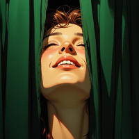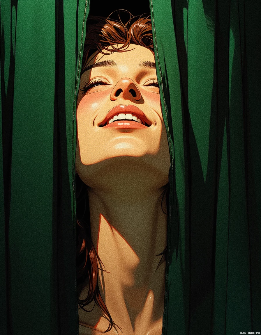 brown hair, and is wearing pink blush on her cheeks. She is looking up towards the top of the image, with her head tilted back slightly. Her eyes are closed, and she appears to be smiling or laughing. The background of the image is dark, but it appears to be a room with green curtains hanging from the ceiling. The curtains are drawn open, revealing