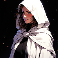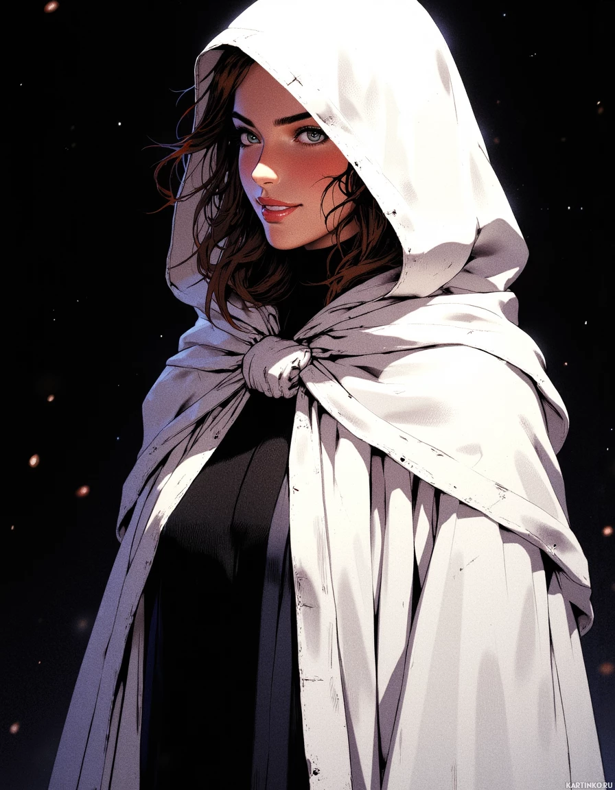a young woman with long brown hair, adorned in a light gray hooded cloak. She is depicted smiling and gazing directly at the camera, her head slightly turned to her right. Her attire consists of a dark