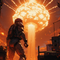 a futuristic scene of an explosion, with a figure clad in armor standing at its center. The individual is positioned with their back to the viewer and appears to be gazing upward toward the blast. * **