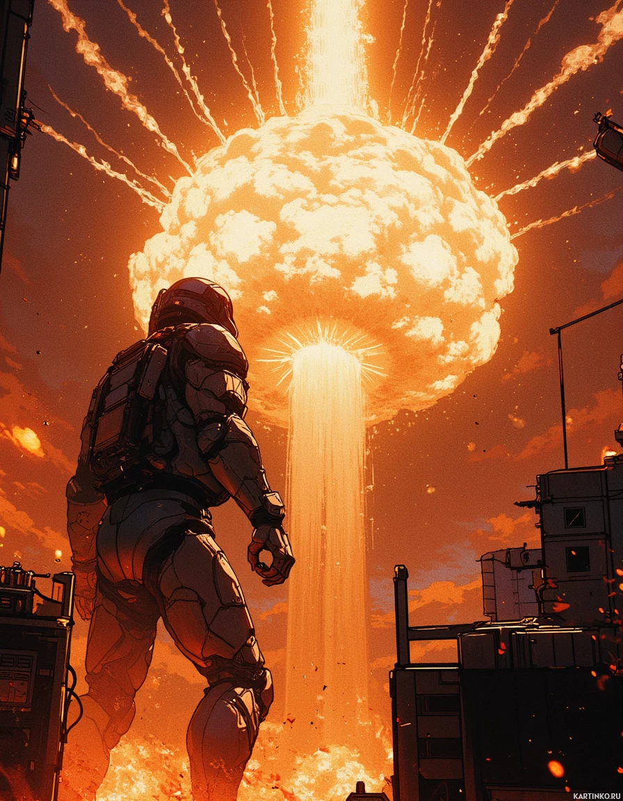 intense heat and light. * The surrounding area is littered with wreckage and destruction, indicating the severity of the explosion. * **Scene Composition** * The figure stands amidst the chaos, their armor glistening in the flickering light of the explosion. * The sky above is ablaze with flames and smoke, casting a reddish-orange glow over the entire scene. * In the foreground, several buildings are visible, some of which appear to be damaged or destroyed by the blast. In summary, the image presents a dramatic and intense scene of an explosion, with a figure clad in futuristic armor standing at its center. The explosion itself is massive, with flames and debris filling the sky, while the surrounding area is littered with wreckage and destruction.