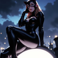 the tips of the fingers. * **Background** * The background of the image is dark and moody, with a cityscape visible in the distance. * There are tall buildings and skyscrapers, as well as streetlights and traffic lights. * The overall atmosphere of the image is one of mystery and intrigue. In summary, the image depicts a woman dressed in a black leather cat suit, complete with a mask and gloves. The costume is designed to resemble that of Catwoman, a character from the Batman universe. The background of the image is dark and moody, with a cityscape visible in the distance.