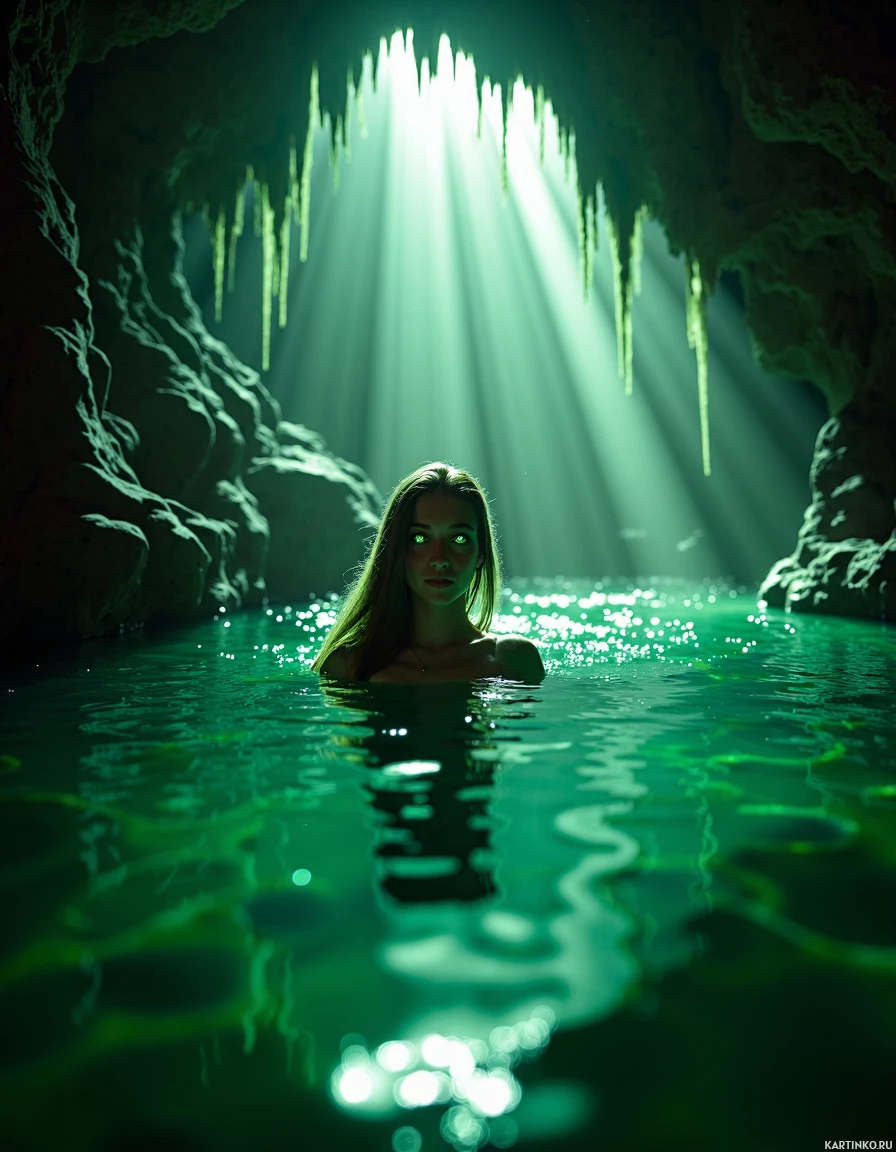 a natural setting, possibly during a photoshoot or adventure trip. The use of green lighting and shadows creates a dramatic effect, adding depth and dimensionality to the scene. Overall, the image presents a visually striking and intriguing composition that invites the viewer to explore further.