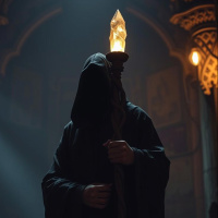a hooded figure, likely male, donning a dark robe that conceals their face and most of their body. The figure grasps a staff in their right hand, which is adorned with a crystal-like object at the top. This object emits a soft,