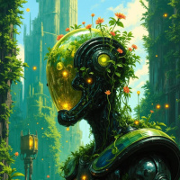 blend of nature reclaiming the ruins of civilization. The image suggests that this is a world where technology has been abandoned or destroyed, leaving behind only remnants of what once was. The robot, now overgrown with vegetation, stands as a testament to the transience of human innovation and the power of nature to reclaim even the most artificial creations.