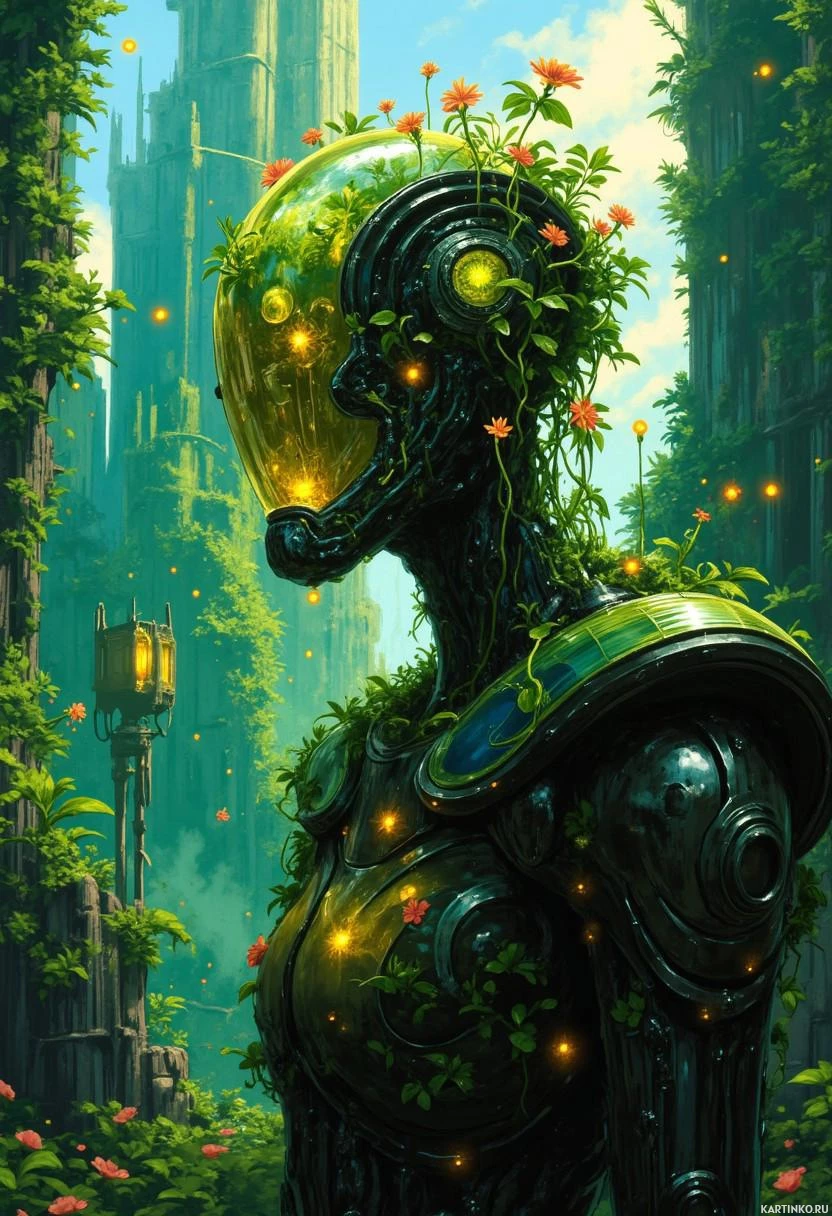 post-apocalyptic scene featuring a robot adorned with flowers and vines. The robot's body is covered in