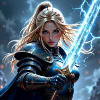 gold designs, complemented by a flowing blue cape that billows behind her. Her gaze is fixed intently on the viewer as she holds the sword aloft, its blade gleaming with an electric
